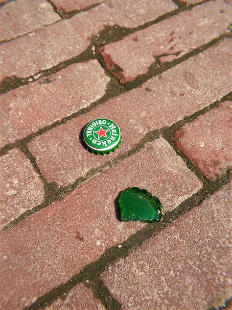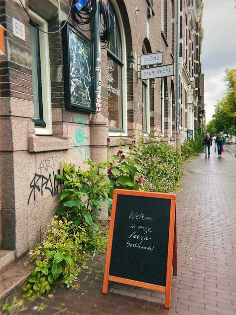 In college, especially when rushing from Fischer Hall to BGH as fast as my blue Converse-d shoes could carry me (blue? seriously?), I developed a habit of looking at the ground because there were always such interesting things to be found there. I started a note on my phone: a Band-aid, the words “R U OK,” autumn leaves that all fell overnight during a storm. Since then, I’ve found yellow ducky stickers (twice!), many flossers and hair ties, a drawing of a horse, bird prints in now-dry concrete, a bright yellow fire hydrant surrounded by buttercups, a bright orange fire hydrant surrounded by weeds and giving a valiant impression of a pumpkin at the airport… I could go on. If I hadn’t been looking at the ground in Amsterdam, I would have missed the juxtaposition of bottle cap and glass shard, the sign telling me there was a bookstore ENTIRELY DEDICATED TO POETRY ARE YOU KIDDING, and a sweet Dutch orange cat in a church garden.